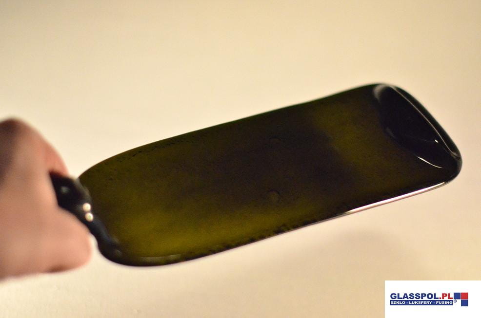 Szklana płaska butelka fusing, idealna na prezent. Nadaje się jako talerzyk pod sushi, może być używana jako świecznik lub patera na sery. Sama w sobie ozdobi każdy stół. Butelka przestawiona na zdjęciu może się różnić odcieniem.